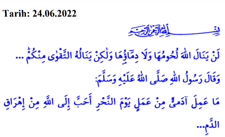 Okuduğum ayet-i kerimede Yüce Rabbimiz şöyle buyuruyor: “Kurbanların ne etleri, ne de kanları Allah’a ulaşır; O’na ulaşacak olan sadece sizin takvanızdır...”1 Okuduğum hadis-i şerifte ise Sevgili Peygamberimiz (s.a.s) şöyle buyuruyor: “Âdemoğlu, kurban günlerinde, Allah için kurban kesmekten daha güzel bir amel işleyemez…”2