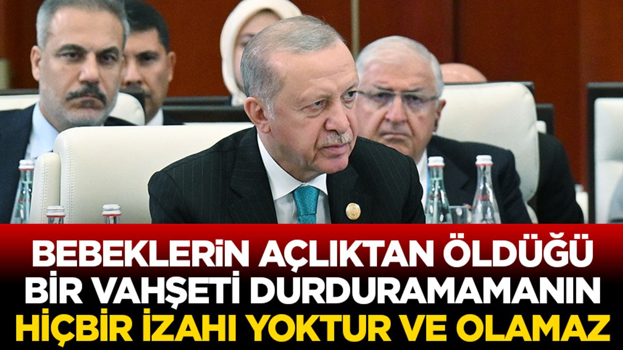 "Uluslararası toplum çoğu çocuk, kadın ve yaşlı 63 binden fazla Gazzelinin katledilmesine, masum yavruların açlıktan kırılmasına engel olamıyorsa hepimiz başımızı iki elimizin arasına alıp düşünmek mecburiyetindeyiz." diyen Erdoğan, şunları kaydetti: