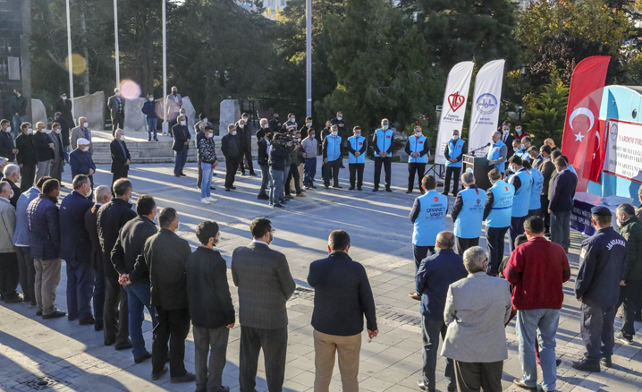Koronavirüs tedbirlerine riayet edilerek gerçekleştirilen törenin ardından yardım tırları dualarla Suriye’ye uğurlandı.
