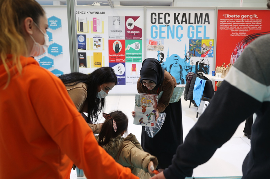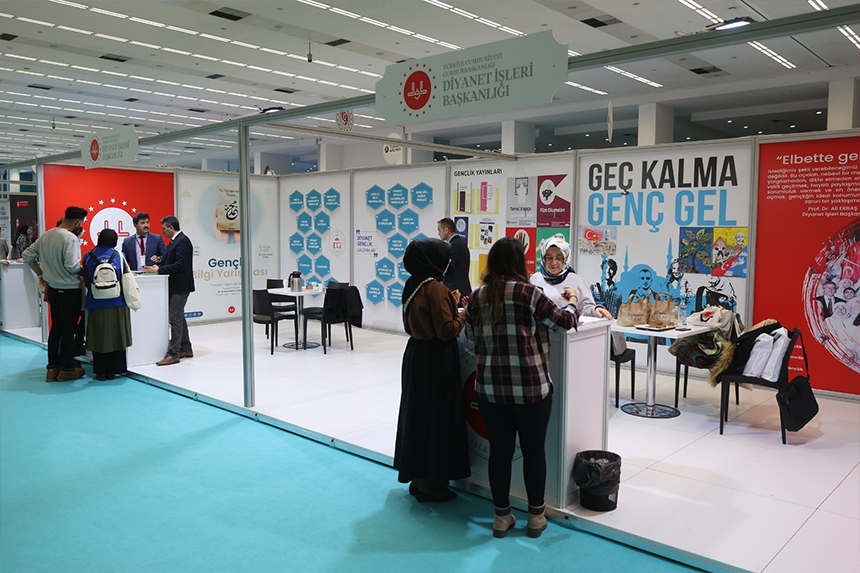 Başkanlık tarafında kurulan stantta Diyanet'in gençlere yönelik yürüttüğü hizmetleri konu alan çeşitli mateyaler paylaşılıyor.