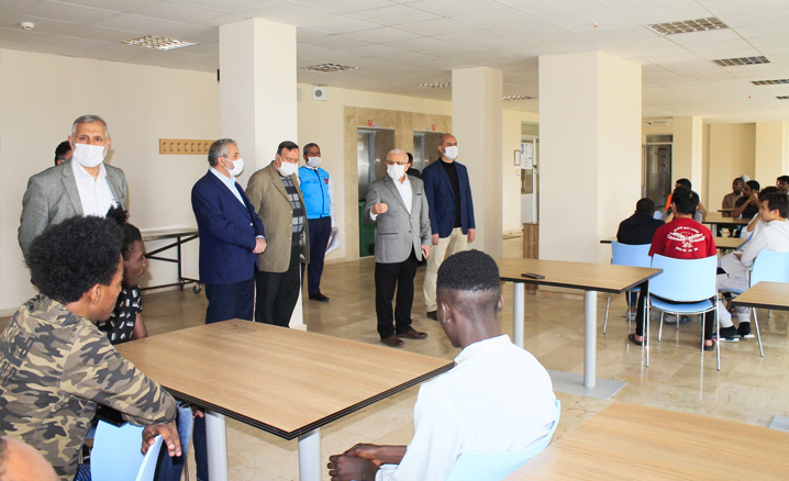 İl Müftüsü Yusuf Akkuş, beraberindeki heyetle birlikte Sivas Uluslararası Şehit Münir Murat Ertekin Anadolu İmam Hatip Lisesi'nde eğitim gören ve koronavirüs (Covid-19) salgını sebebiyle ülkelerine dönemeyen yabancı uyruklu öğrencileri, kaldıkları pansiyonda ziyaret etti.
