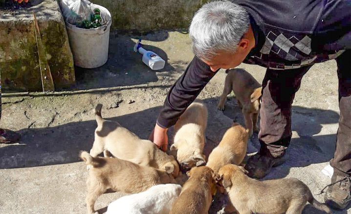 Uzun süre aç kaldıkları için bitkin düşen sokak hayvanlarını, din görevlileri elleriyle besliyor.