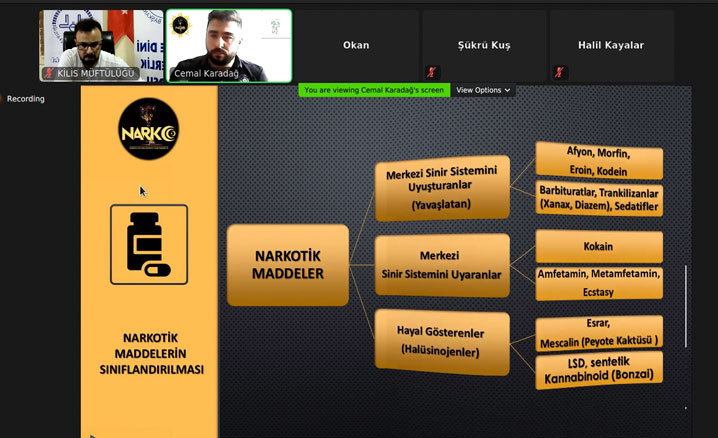 Koronavirüs tedbirleri kapsamında çevrimiçi gerçekleştirilen seminerlerde Narkolog Polis Okan Sarı; uyuşturucu bağımlılığının nasıl başladığı, uyuşturucu çeşitleri, kullanım alanları ve uyuşturucuyla nasıl mücadele edildiğine dair bilgi verdi.