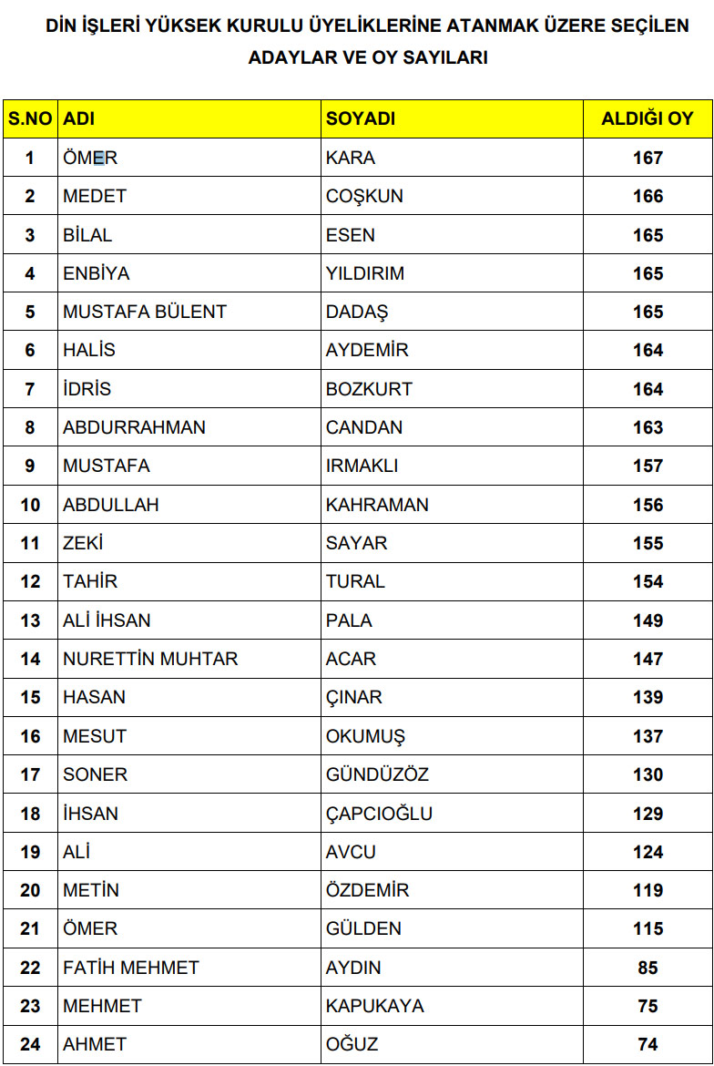 Diyanet İşleri Başkanlığı üst düzey yöneticileri, ilahiyat ve İslami ilimler fakültelerinde görev yapan akademisyenler, 81 il müftüsü, Dini Yüksek İhtisas merkezlerinin müdürleri ve eğitim merkezlerinden bazı eğitim görevlileri ile her bölgeyi temsilen ilçe müftüleri, başvaizler, başimam hatipler ve Kur’an kursu başöğreticilerinden oluşan "Aday Tespit Kurulu" tarafından yapılan oylamada, aşağıdaki isimler ilk 24’e girerek "Aday Üye" olarak belirlendi:
