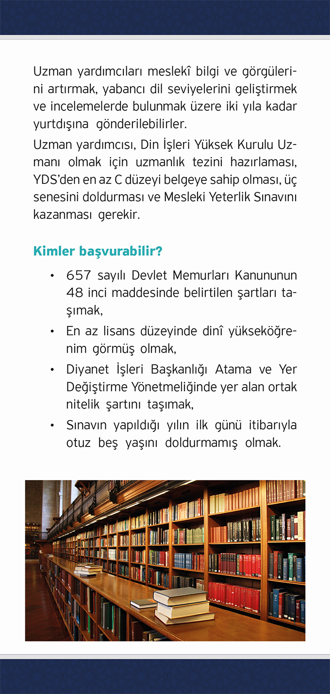Uzman yardımcısı, Din İşleri Yüksek Kurulu Uzmanı olmak için uzmanlık tezini hazırlaması, YDS’den en az C düzeyi belgeye sahip olması, üç senesini doldurması ve Mesleki Yeterlik Sınavını kazanması gerekir.