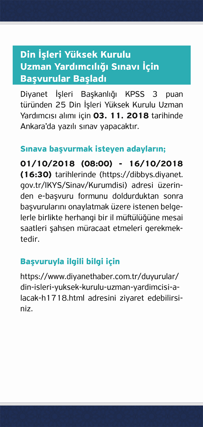 Diyanet İşleri Başkanlığı KPSS 3 puan türünden 25 Din İşleri Yüksek Kurulu Uzman Yardımcısı alımı için 03. 11. 2018 tarihinde Ankara’da yazılı sınav yapacaktır.