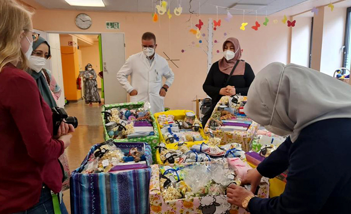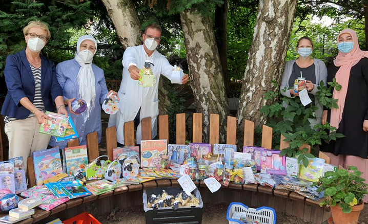 Dortmund-Eving DİTİB Selimiye Camii Kadınlar Kolu üyesi Merzuka Sönmez ve beraberindeki kadın kolları heyeti hem çocuklara hem de hastane personeli için hazırladıkları hediyeleri, çocuk kliniği direktörü Prof. Dr. Dominik Schneider, çocuk terapisti Sylvia Machentanz ve mali işler sorumlusu Barbara Drewes’e teslim etti.