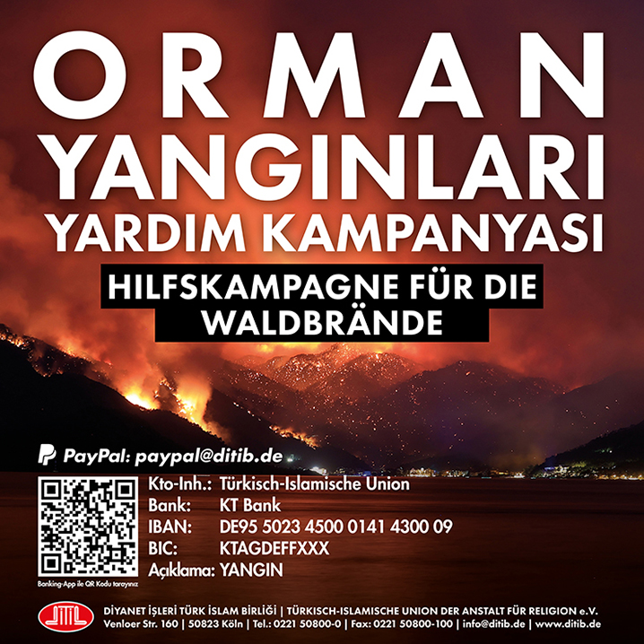 Son günlerde yaşanılan afetlere dikkat çeken Türkmen, "Bir yandan Almanya’nın Kuzey Ren Vestfalya ve Rheinland-Pfalz eyaletlerinde sel felaketinin açtığı yaraları sarmaya çalışırken diğer yandan Türkiye’nin değişik noktalarında ciğerlerimizi dağlayan orman yangınlarıyla mücadele ediyoruz. Böylesi zor zamanlarda bizlere düşen, dayanışma, yardımlaşma, birlik ve beraberlik içerisinde afetlerle mücadele etmek ve yaralarımızı el birliğiyle sarmaktır. Yaşanan bu büyük felaketin mağdurlarının acı ve üzüntülerini paylaşmak ve yanıp küle dönen alanların yeniden ağaçlandırılmasına destek olmak amacıyla Almanya çapında bir yardım kampanyası başlatılmıştır. Camiamız ve tüm hayırsever kardeşlerimiz www.ditib.de adresi üzerinden veya banka yoluyla Turkisch-Islamische Union adına açılan DE95 5023 4500 0141 4300 09 numaralı IBAN hesabına bağışlarını yaparak kampanyamıza destek olabileceklerdir.“ dedi.