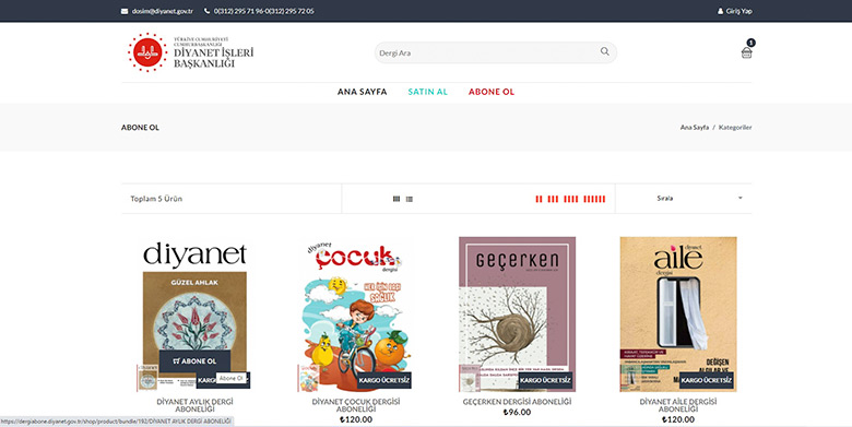 Döner Sermaye İşletme Müdürlüğünce hazırlanan https://dergiabone.diyanet.gov.tr internet adresi üzerinden vatandaşlar, banka veya kredi kartları ile kolay bir şekilde ödeme yaparak Diyanet dergilerine online abone olabilecek.