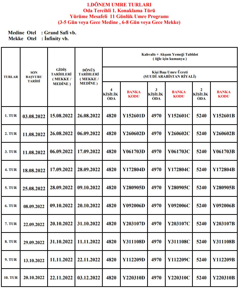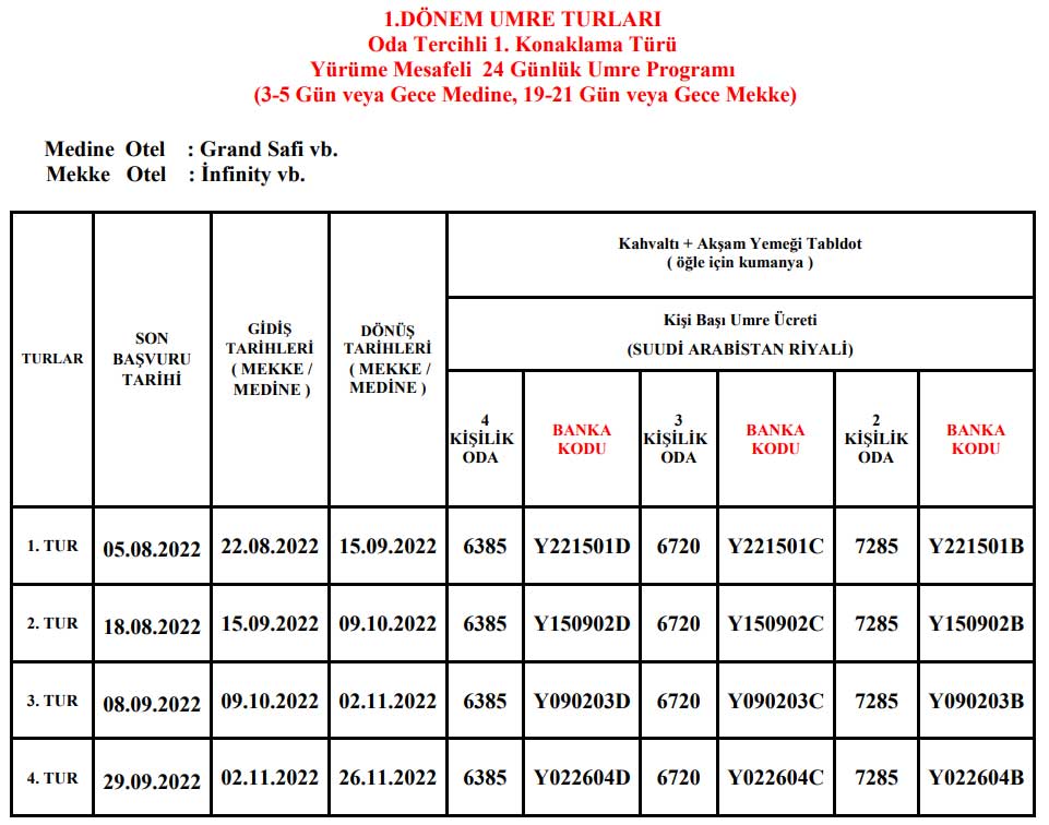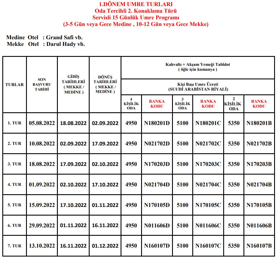 1. Umreye gitmek isteyenler ilan edilen umre turuna ait banka kodu ile Hac ve Umre Muhasebe Koordinatörlüğünce anlaşmalı bankalara açtırılan umre kurumsal tahsilat hesabına ücretini peşin olarak yatıracaklardır.