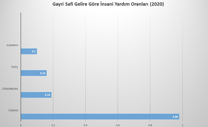 Küresel İnsani Yardım 2021 Yılı Raporu'na göre pandeminin dünya genelinde etkisini gösterdiği 2020 yılında küresel çapta 30,9 milyar dolar insani yardım yapılırken, Türkiye, 8.03 milyar dolar insani yardım yaptı.