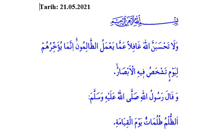 Diyanet İşleri Başkanlığınca hazırlanan, 21 Mayıs 2021 tarihli ve "ZULÜM CEZASIZ KALMAZ" konulu cuma hutbesi.