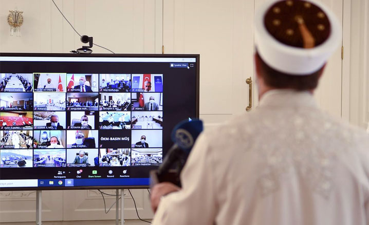 Eğitim Hizmetleri Genel Müdürlüğü koordinesinde çevrimiçi/online gerçekleştirilen toplantıda binin üzerinde müftüye hitap eden Diyanet İşleri Başkanı Erbaş, “Milletimizin, yaşadığımız bu musibet karşısında en doğru tavrı almasına rehberlik etmeye çalıştık. İbret, tedbir, tevekkül ve dua olmak üzere 4 temel ilkeye her vesileyle dikkat çektik.” dedi.