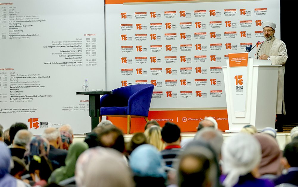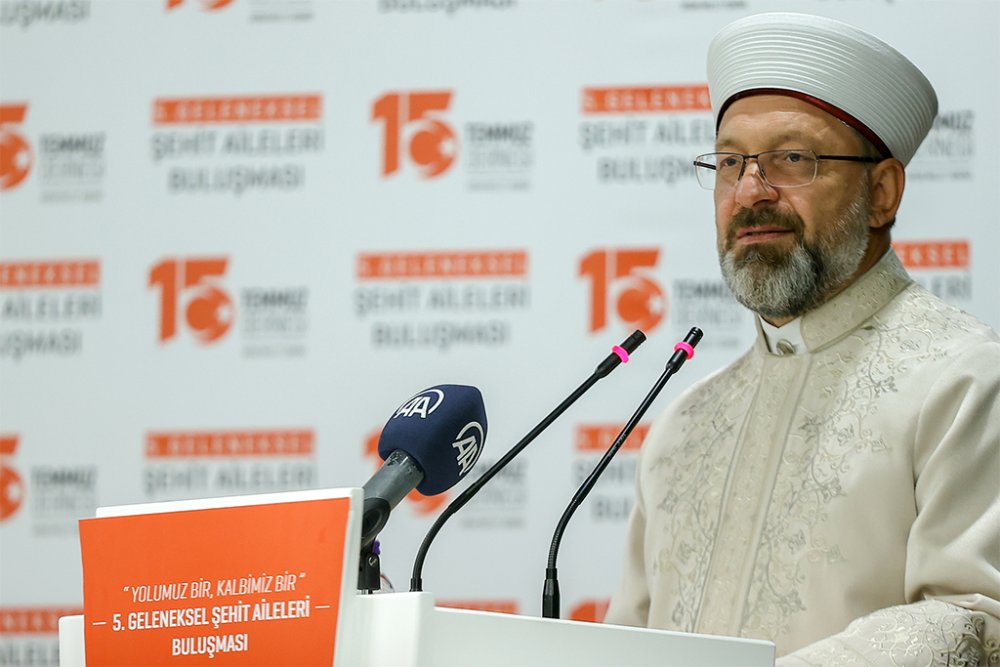 Erbaş, Antalya'nın Kemer ilçesindeki bir otelde düzenlenen "15 Temmuz Derneği 5. Şehit Aileleri Buluşması"nda yaptığı konuşmada, inançlarını, vatanlarını koruma uğruna en değerli canlarını ortaya koyan şehitlere saygı ve minnet duyduklarını söyledi.
