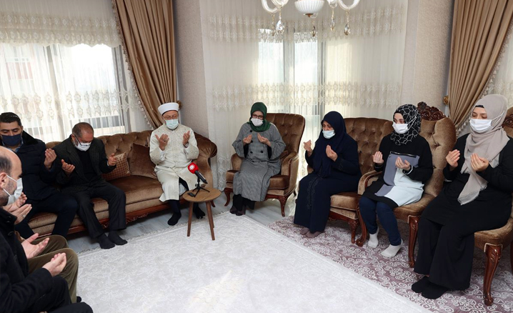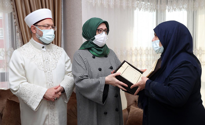 Ziyarette Başkan Erbaş’ın eşi Seher Erbaş, anne Beyhan Cengiz’e Kur’an-ı Kerim takdim etti.