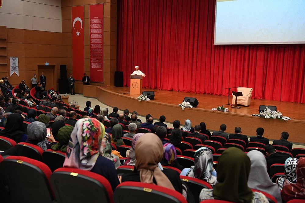 Konuşmasına Rektör Prof. Dr. Mazhar Bağlı ve katılımcılara teşekkür ederek başlayan Diyanet İşleri Başkanı Prof. Dr. Ali Erbaş, “Bu mübarek Cuma gününde Allah’ın rahmeti, bereketi, ikramı ve ihsanı hepinizin üzerinizde olsun. Çok mutluyum. Çünkü, ilmin yuvası ve bilginin üretildiği merkez üniversitedeyim. Yıllardır ders anlattım ve bugün kürsüdeyim. Özlüyoruz bazen kürsüyü." dedi.