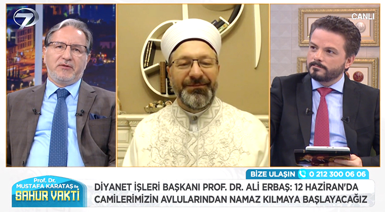 Diyanet İşleri Başkanı Prof. Dr. Ali Erbaş Kanal 7 televizyonunda katıldığı "Prof. Dr. Mustafa Karataş ile Sahur Vakti" programında, Prof. Dr. Mustafa Karataş'ın camilerin ne zaman yeniden ibadete açılak, hacca yazılanlarının durumları ne olacak (bu yıl hac olacak mı), kadir gecesinin nasıl değerlendirmeliyiz ve camilerde bayram namazları kılınacak mı? şeklindeki sorularını cevaplandırdı.