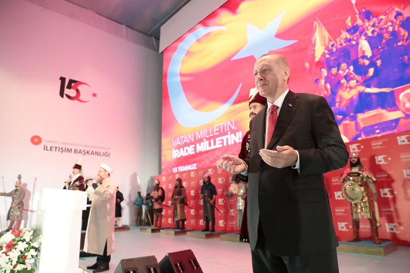 Atatürk Havalimanı’nın anlamlı bir mekân olduğuna ve 15 Temmuz gecesi burada iki anın yaşandığına vurgu yapan Cumhurbaşkanı Erdoğan, “Bunlardan bir tanesi saat 23:15 civarı ve tankların arasından Sayın Bay Kemal gelip Bakırköy’e geçti. Bakırköy Belediyesinde kendi ifadesiyle, ‘Gidebilecek bir otel bulamadığım için oraya gittim’ dedi. 01:15 ve biz de yine buraya indik. Eşim, kızım, torunlarım ve damadımla beraber buraya indik. Burada kim vardı, burada millet vardı. Beraberce buradan üzerimizden geçen F16’lar vardı, üzerimizden geçen helikopterler vardı, onlar mermilerini yağdırıyordu. Fakat biz bir şeye inanıyorduk: ‘La tahzen innallahe meana’, ‘Korkmayın Allah bizimle beraberdir” dedi.