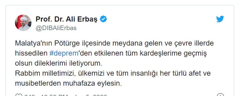 Bu akşam Malatya'nın Pötürge ilçesinde meydana gelen 5 şiddetindeki depremin ardından Diyanet İşleri Başkanı Prof. Dr. Ali Erbaş, kişisel sosyal medya hesaplarınan geçmiş olsun mesajı yayınladı.