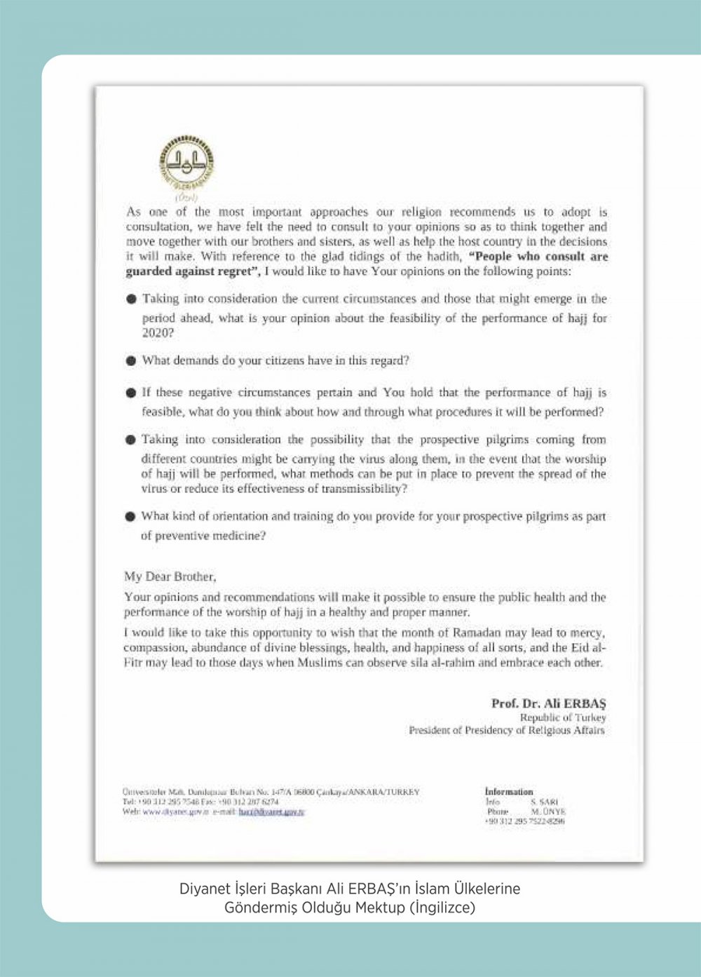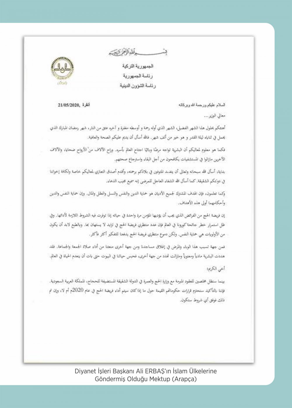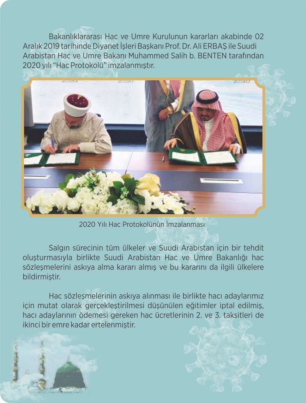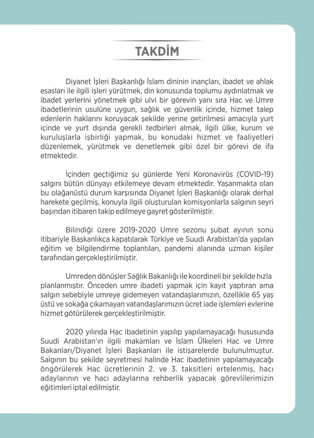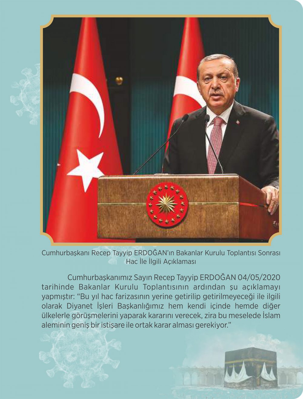 "Umreden dönüşler Sağlık Bakanlığı ile koordineli bir şekilde hızla planlanmıştır. Önceden umre ibadeti yapmak için kayıt yaptıran ama salgın sebebiyle umreye gidemeyen vatandaşlarımızın, özellikle 65 yaş üstü ve sokağa çıkamayan vatandaşlarımızın ücret iade işlemleri evlerine hizmet götürülerek gerçekleştirilmiştir. 2020 yılında hac ibadetinin yapılıp yapılamayacağı hususunda Suudi Arabistan'ın ilgili makamları ve İslam ülkeleri Hac ve Umre Bakanları/Diyanet İşleri Başkanları ile istişarelerde bulunulmuştur. Salgının bu şekilde seyretmesi halinde hac ibadetinin yapılamayacağı öngörülerek hac ücretlerinin 2. ve 3. taksitleri ertelenmiş, hacı adaylarının ve hacı adaylarına rehberlik yapacak görevlilerimizin eğitimleri iptal edilmiştir."