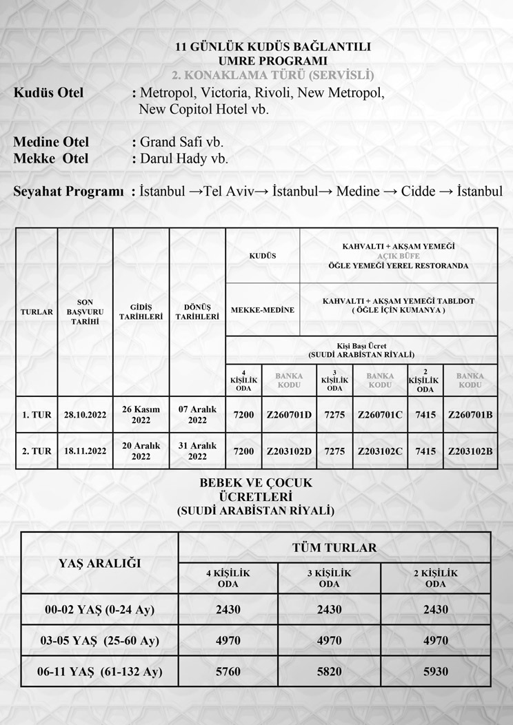 7. Kudüs Bağlantılı Umre Programında iki, üç ve dört kişilik odalar için kayıt yapılabilecektir. Ancak Kudüs'te odalar ikişer kişilik olup yerleşimler buna göre yapılacaktır.