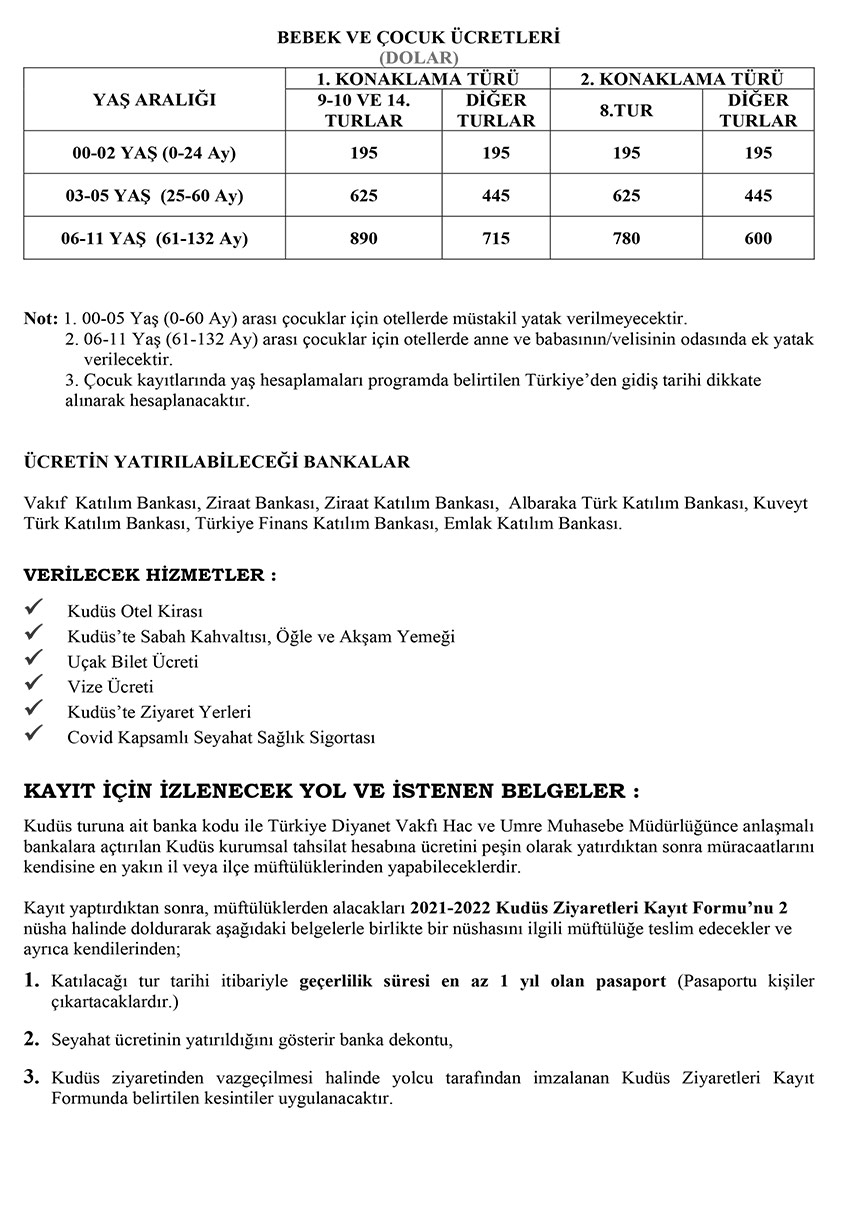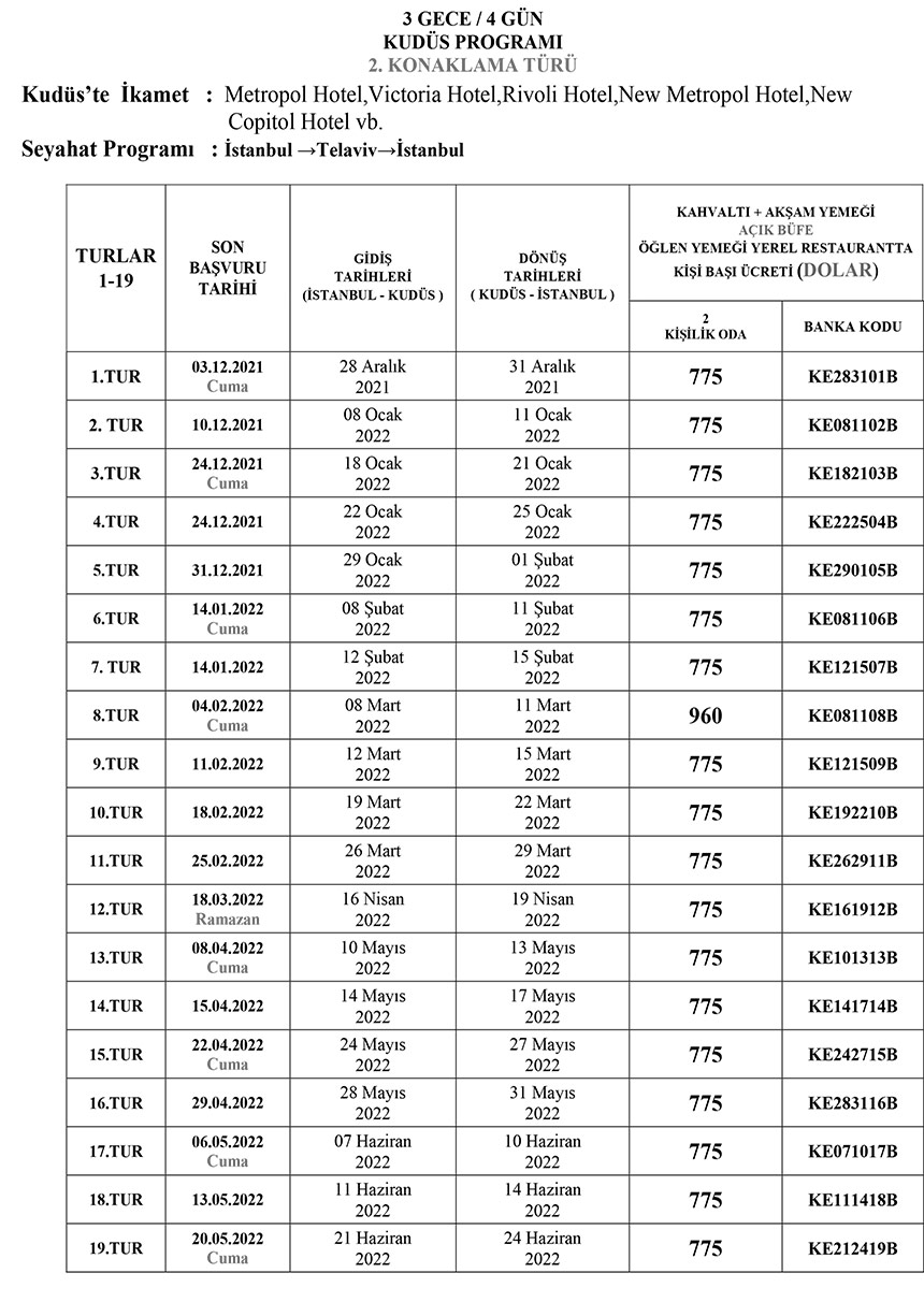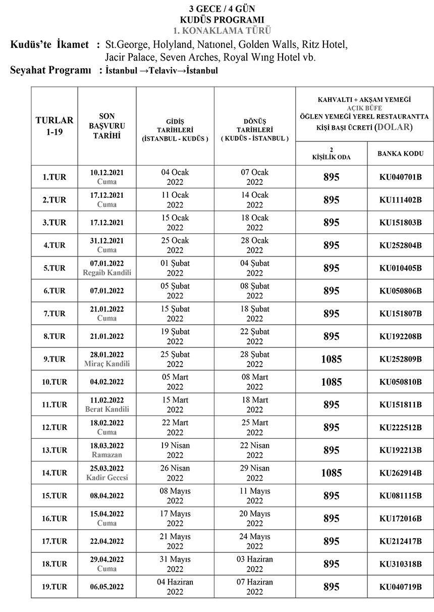 Diyanet İşleri Başkanlığı Hac ve Umre Hizmetleri genel Müdürlüğü "Kudüs Turları"na ilişkin program çizelgesini paylaştı. Buna göre ilk ziyaret 04 Ocak 2022'de yapılacak.