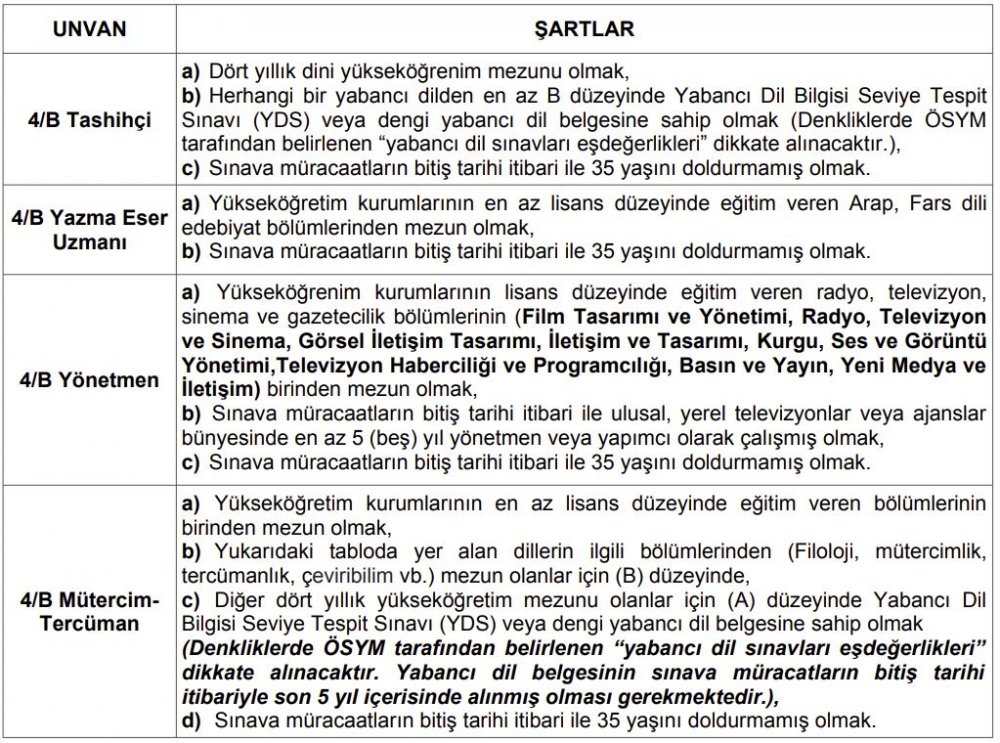 Diyanet İşleri Başkanlığı Merkez Teşkilatında münhal bulunan sözleşmeli pozisyonlara tashihçi, yazma eser uzmanı ve yönetmen alım ilanına çıktı.