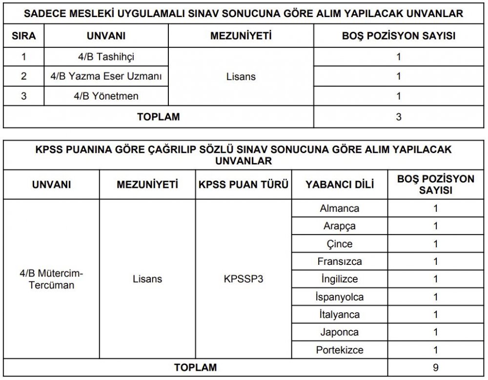 2. 2020 yılı Kamu Personel Seçme Sınavı (KPSS) (B) grubu puan sırası esas alınarak çağrılacak adaylar için yapılacak sözlü sınav sonucuna göre mütercim-tercüman alımı yapılacaktır. Boş pozisyonlara ilişkin bilgiler aşağıdaki tablolarda yer almaktadır.