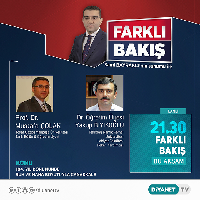 Çanakkale Zaferinin ruh ve mana boyutuyla anlatılacağı Farklı Bakış programı, Sami Bayrakçı’nın sunumuyla, Gaziosmanpaşa Üniversitesi Tarih Bölümü Öğretim Üyesi Prof. Dr. Mustafa Çolak ve Namık Kemal Üniversitesi İlahiyat Fakültesi Dekan Yardımcısı Dr. Öğretim Üyesi Yakup Bıyıkoğlu konuk ediyor.