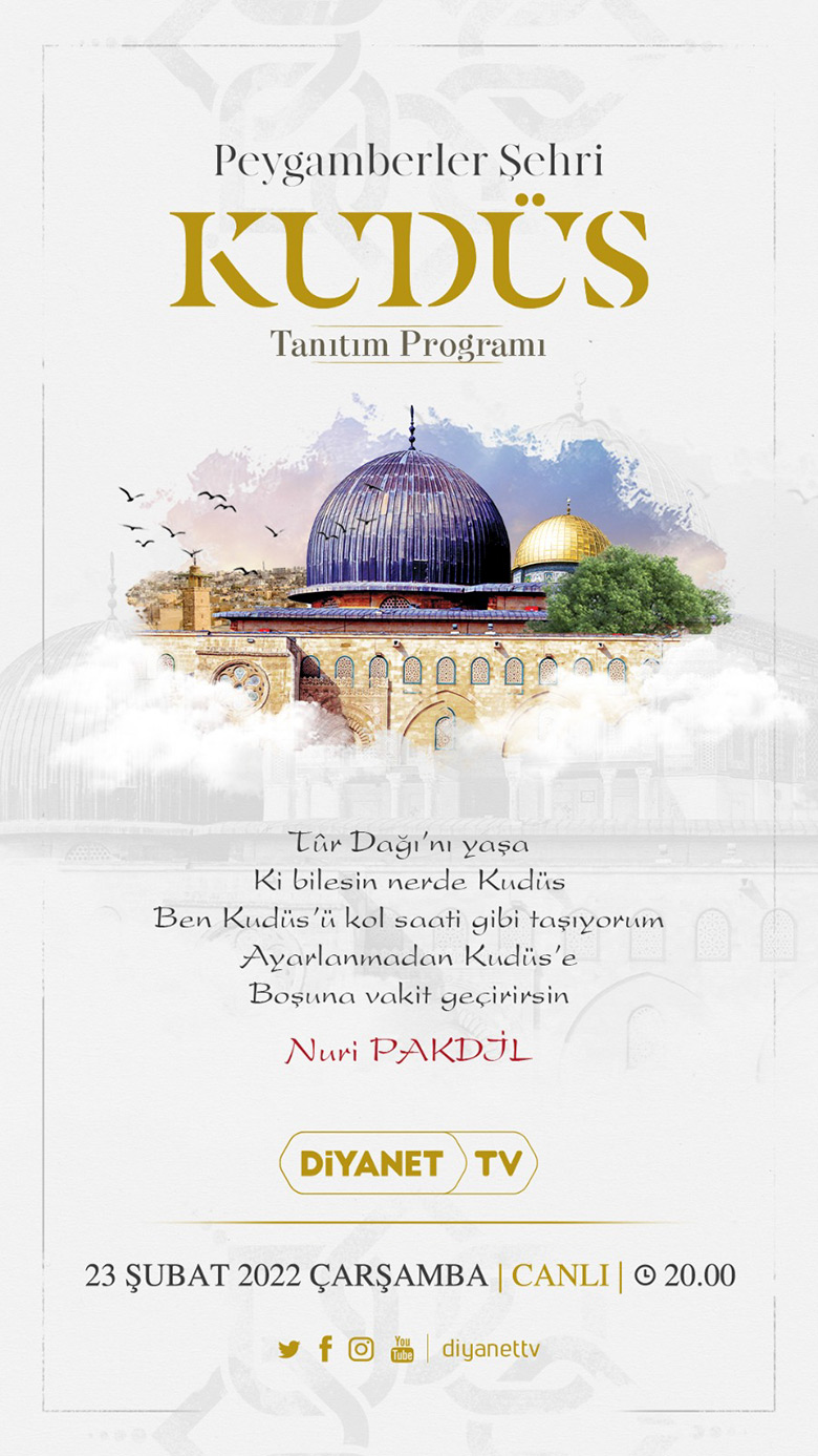 Diyanet TV tarafından hazırlanan "Peygamberler Şehri Kudüs" belgeselinin tanıtım programı, Diyanet İşleri Başkanı Prof. Dr. Ali Erbaş'ın katılımıyla yarın (23 Şubat Çarşamba) yapılacak.