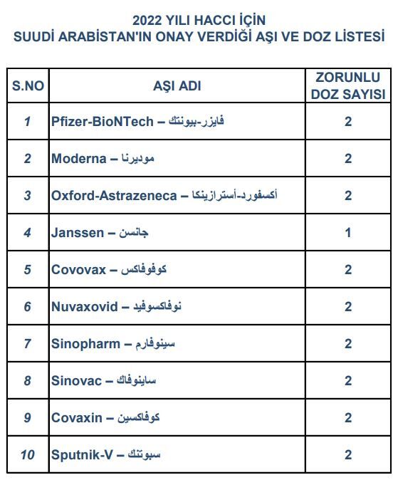 3- 2022 yılında hacca gideceklerde aşı şartı aranmaktadır. Suudi Arabistan Hac ve Umre Bakanlığınca yapılan açıklamaya göre Türkiye'de yaygın olarak kullanılan Biontech ve Sinovac aşıları ile Suudi Arabistan makamlarınca kabul edilen diğer aşılar da geçerli olacaktır. (http://hac.gov.tr/asi.pdf) Bu aşılarda 2 doz şartı aranmaktadır.
