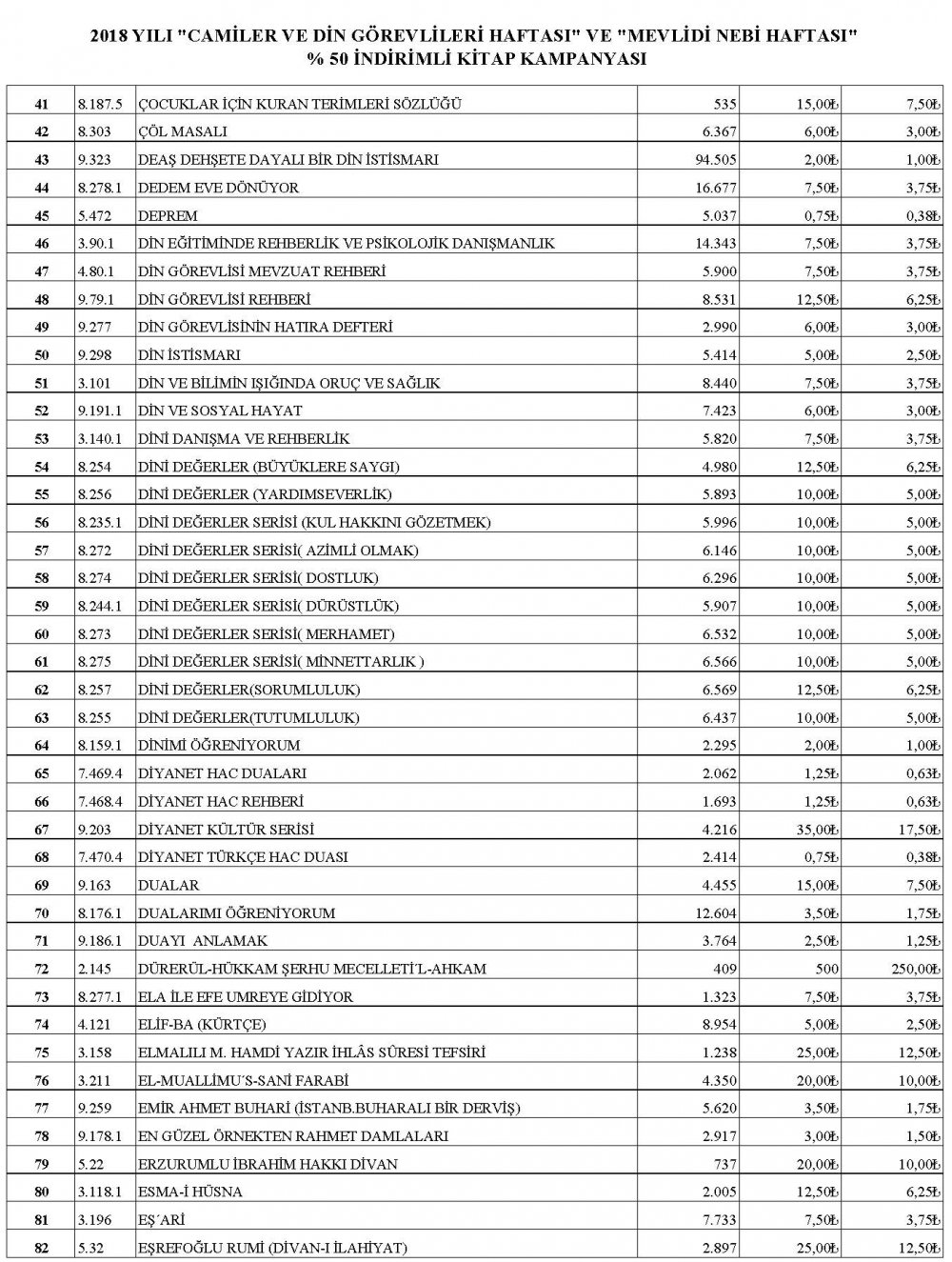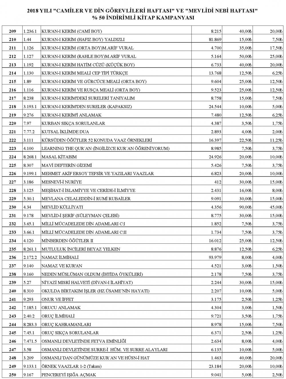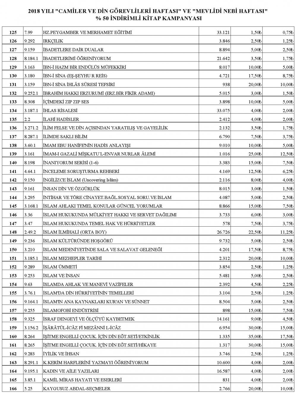 Hafta münasebetiyle düzenlenecek olan etkinliklerde değerlendirilmek üzere, bedeli peşin ödenmek ve kargo ücreti İşletme Müdürlüğü'nce karşılanmak kaydıyla; müftülüklerimiz, çeşitli kurum ve kuruluşlar ile vatandaşlarımızdan gelecek talepleri karşılamak amacıyla, ek listede belirtilen eserlerde üzeri fiyatından %50 indirim uygulanacaktır. Kampanyamız stoklarımızla sınırlı olduğu için söz konusu eserlerden mevcudu bitenlerin yerine, yine listede belirtilen eşdeğer eserlerden gönderilecektir.