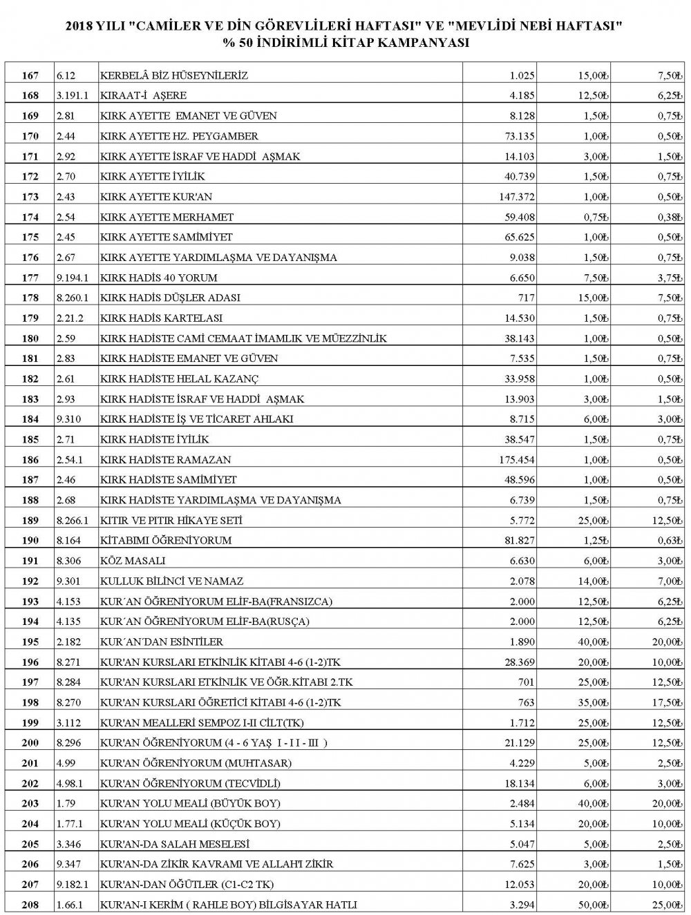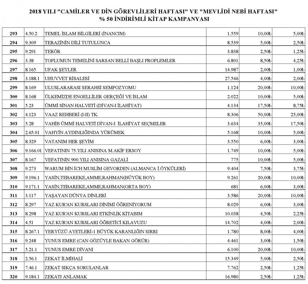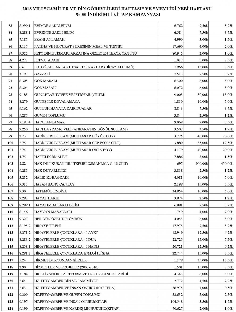 Hafta münasebetiyle düzenlenecek olan etkinliklerde değerlendirilmek üzere, bedeli peşin ödenmek ve kargo ücreti İşletme Müdürlüğü'nce karşılanmak kaydıyla; müftülüklerimiz, çeşitli kurum ve kuruluşlar ile vatandaşlarımızdan gelecek talepleri karşılamak amacıyla, ek listede belirtilen eserlerde üzeri fiyatından %50 indirim uygulanacaktır. Kampanyamız stoklarımızla sınırlı olduğu için söz konusu eserlerden mevcudu bitenlerin yerine, yine listede belirtilen eşdeğer eserlerden gönderilecektir.