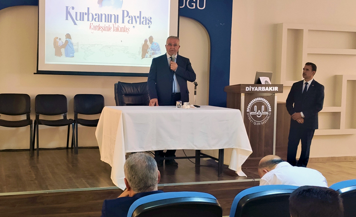 Bu kapsamda Diyarbakır İl Müftülüğü ile Türkiye Diyanet Vakfı Diyarbakır Şubesi ev sahipliğinde "2022 Yılı Vekalet Yoluyla Kurban Kesim Organizasyonu Tanıtım ve İstişare Toplantısı" düzenlendi.