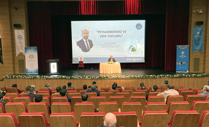 Ardından “Peygamberimiz ve Vefa Toplumu” konulu konferansı sunmak üzere kürsüye davet edilen Dr. İmran Çelik, vefanın tanımını yaparak, “Başta Cenab-ı Hak olmak üzere O’nun biricik Resulü Hz. Muhammed Mustafa (s.a.s.)’e daha sonra insanın kendisine, ailesine, akrabalarına, eşine, dostuna, çevresine ve bütün varlıklara karşı emanet ve sadakat temelli münasebet kurmasıdır.” dedi.