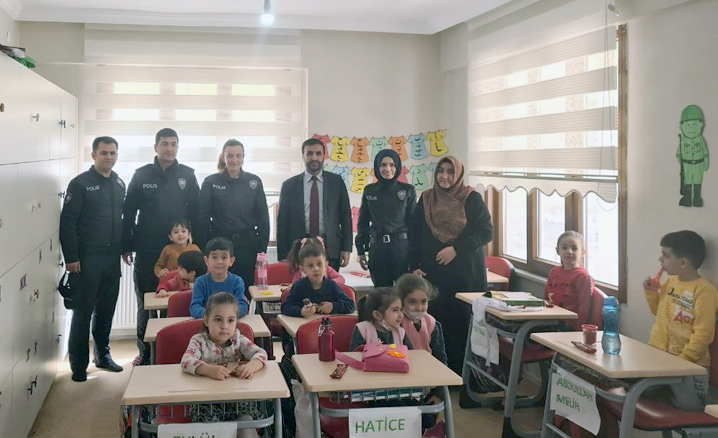 Ziyarette Emniyet ve Polis Teşkilatı hakkında bilgi veren İlçe Emniyet Müdürü Ömer Bozkurt, öğrencilere çeşitli hediyeler takdim etti.