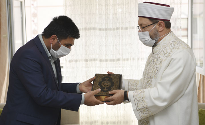 Barış Çakan için dua eden Başkan Erbaş, Baba Nihat Çakan'a Kur'an-ı Kerim takdim etti.