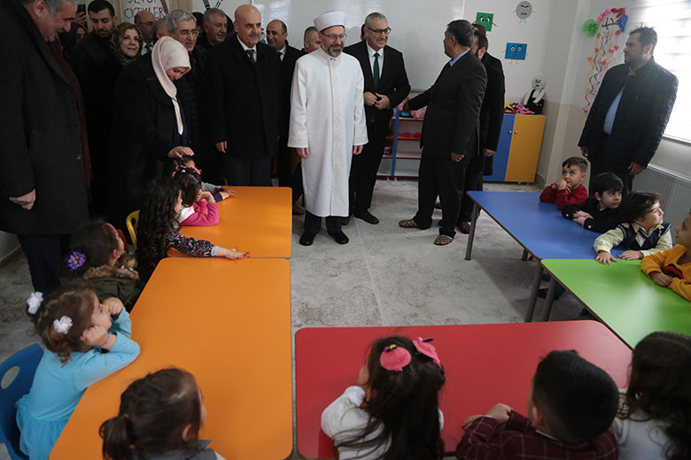 Başkan Erbaş, daha sonra bir kreş sınıfını ziyaret ederek, çocuklarla konuştu, onlara hediye ve şeker ikram etti.