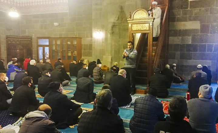 Proje kapsamında cuma günleri Narmanlı Camii'nde görevlendirilen Erzurum Aile Çalışma ve Sosyal Hizmetler İl Müdürlüğü görevlisi Volkan Yılmaz, din görevlisi tarafından irad edilen cuma hutbesini, işitme engelli cemaatin rahatlıkla görebileceği bir alanda işaret diline çeviriyor.