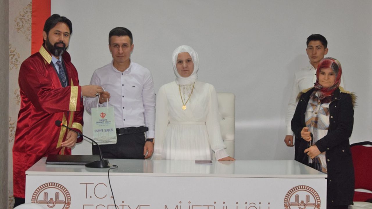 Espiye Müftüsü Osman Gülbe, Diyanet İşleri Başkanlığının yetkilendirmesiyle 2018 yılından bu yana resmi nikah kıyma işlemlerini sürdürdüklerini belirterek "Vatandaşlarımızın Müftülüğümüze teveccühü her geçen gün artıyor. Talep olduğunda nikah kıymaya devam ediyoruz. Resmi nikah işlemleri yerine getirildikten sonra Kur'an-ı Kerim okuyarak, dua ediyoruz. Genç çiftlerimize evliliğe ilk adım semineri veriyoruz. Vatandaşa nikahın dini yönünü, görev ve sorumluluklarını hatırlatıyoruz. Çiftlere, Kur'an-ı Kerim ve dini kitaplar hediye ediyoruz. Ailenin kuruluşunda çok önemli bir yeri olan nikah akdinin hem resmi hem dini yönünü icra ediyoruz. Bizim farkımız bu. Resmi evraklar, diğer kurumların istediği evraklar hepsi aynı. Bugüne kadar 130 nikah kıydık, talep olduğunda karşılıyoruz. Genç çiftlerimizin mutlu günlerine ortak olduk. Hepsine Allah'tan ömür boyu mutluluklar diliyorum. Bizlere güvenen, Müftülüğümüze gelip nikahlarını kıydıran tüm vatandaşlarımıza teşekkür ediyorum." dedi.