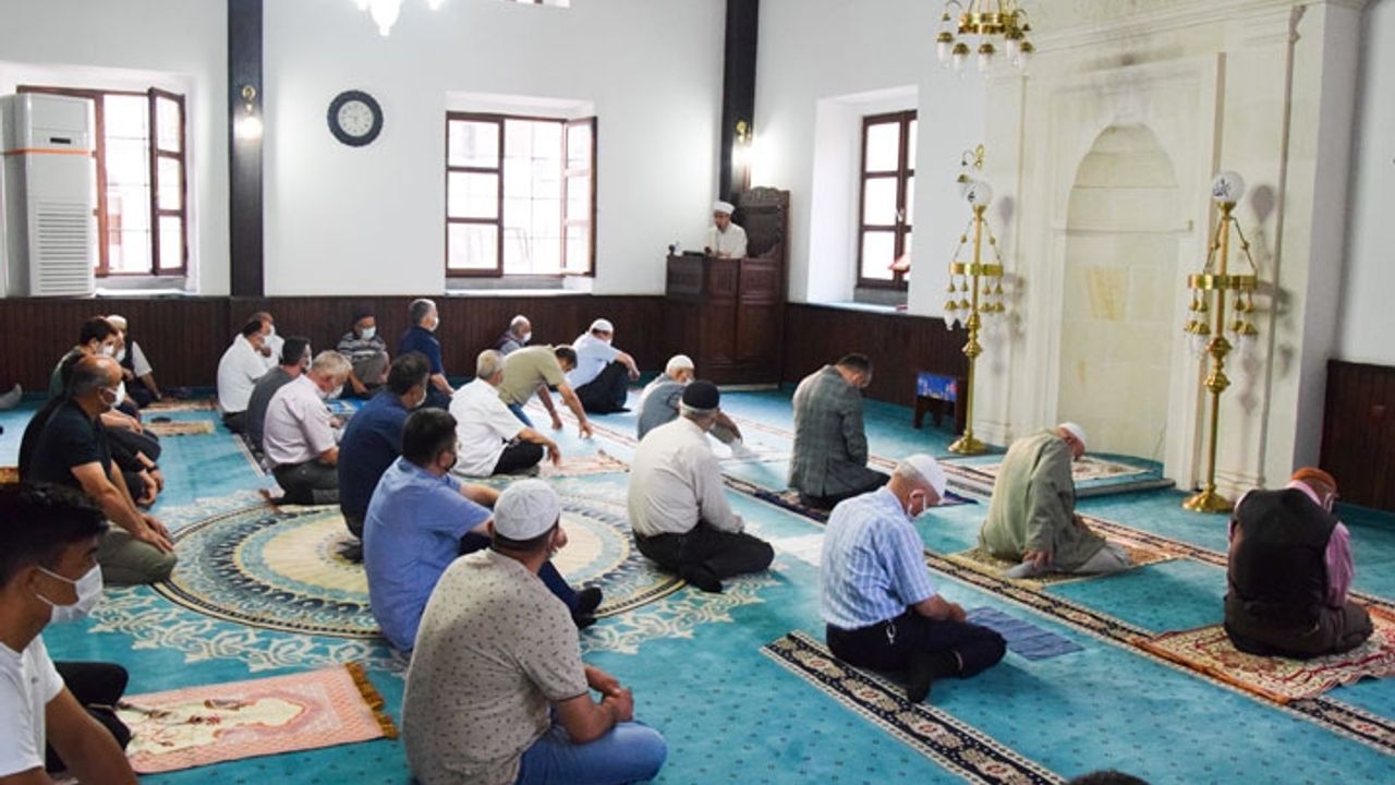 Bayram namazını kılmak için Merkez Camii'ni dolduran vatandaşlar, fiziki mesafe kuralına göre saf tuttu.