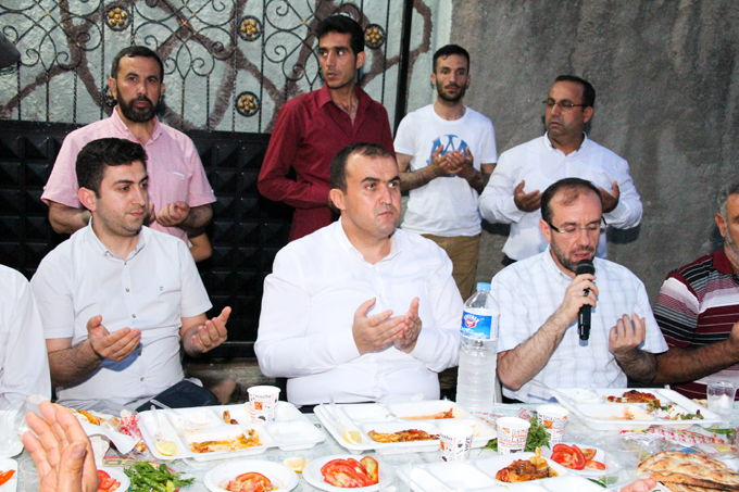 Evlerinde iftar için hazırladıkları yemeklerini komşularıyla paylaşmak üzere bir araya gelen mahalle sakinleri, iftar öncesi Kur’an-ı Kerim tilaveti ve okunan ilahileri dinleyerek yapılan dualara âmin dediler.