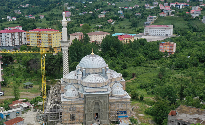 Eynesil ilçesinde temeli 1987'de atılan Yeşil Cami, Selçuklu ve Osmanlı mimarisinden esinlenilerek inşa ediliyor.