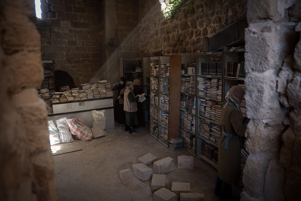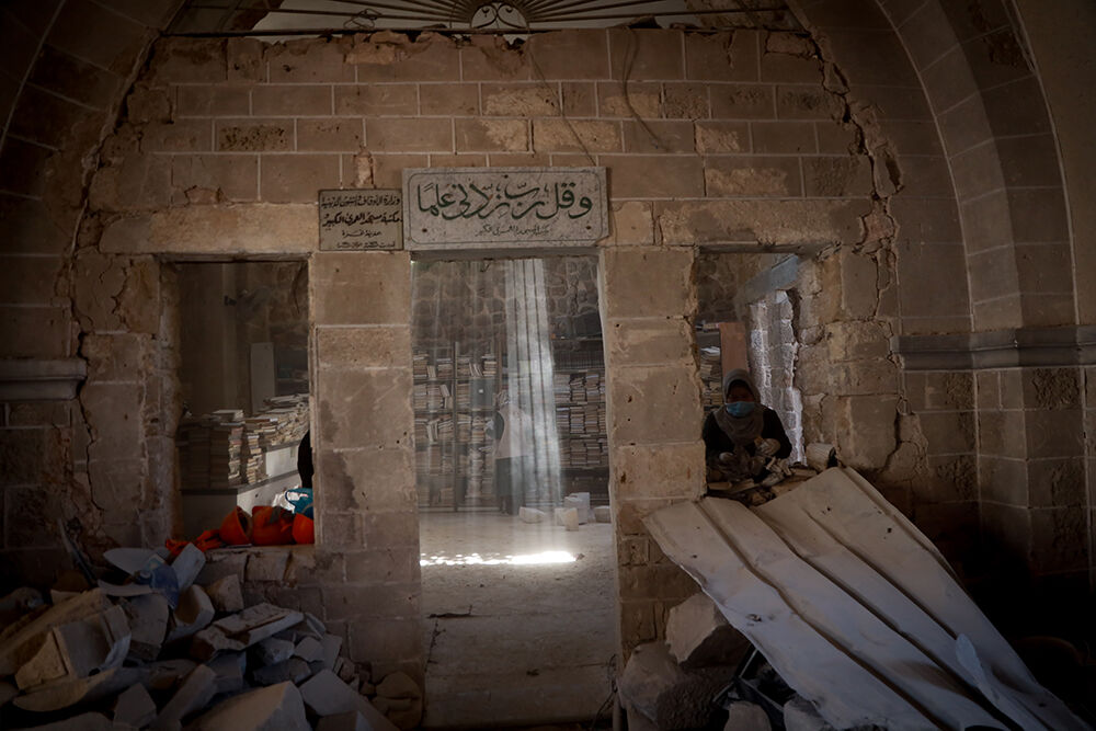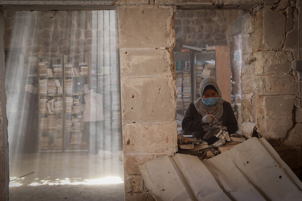 İşgalci saldırılarında ağır hasar gören Gazze’deki Büyük Ömeri Camii Kütüphanesi’nde Filistinli gönüllüler, zarar gören kitap ve el yazması eserleri kurtarmak için onarım, temizleme ve tasnif çalışmaları yürütüyor.