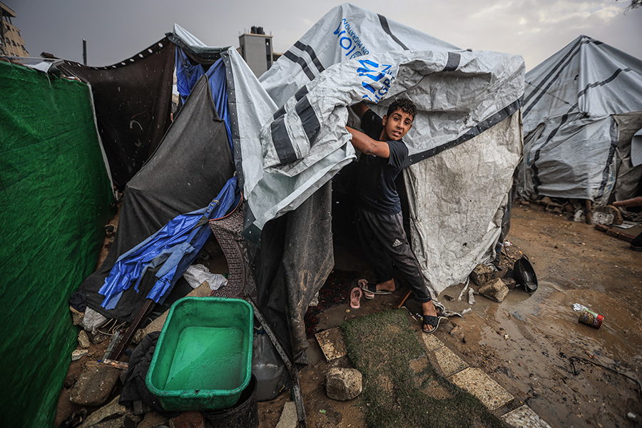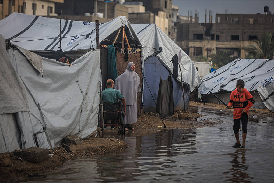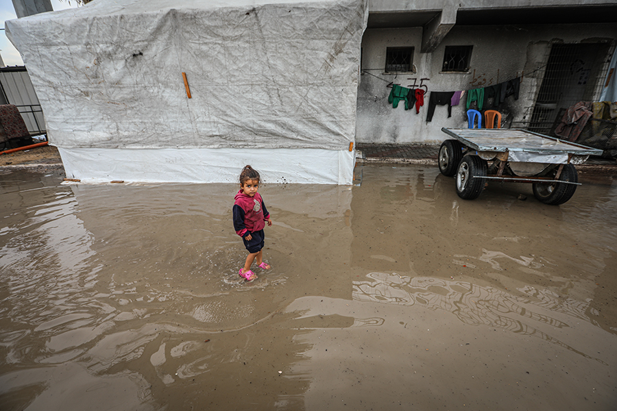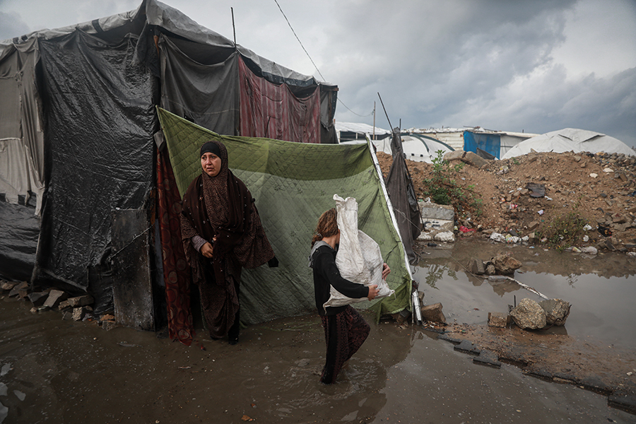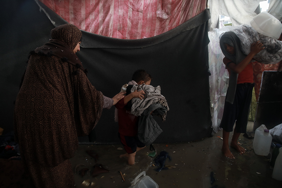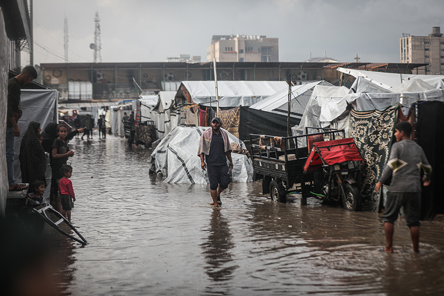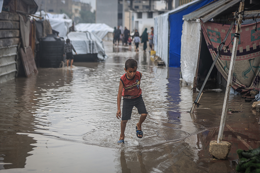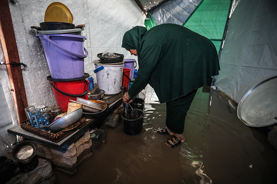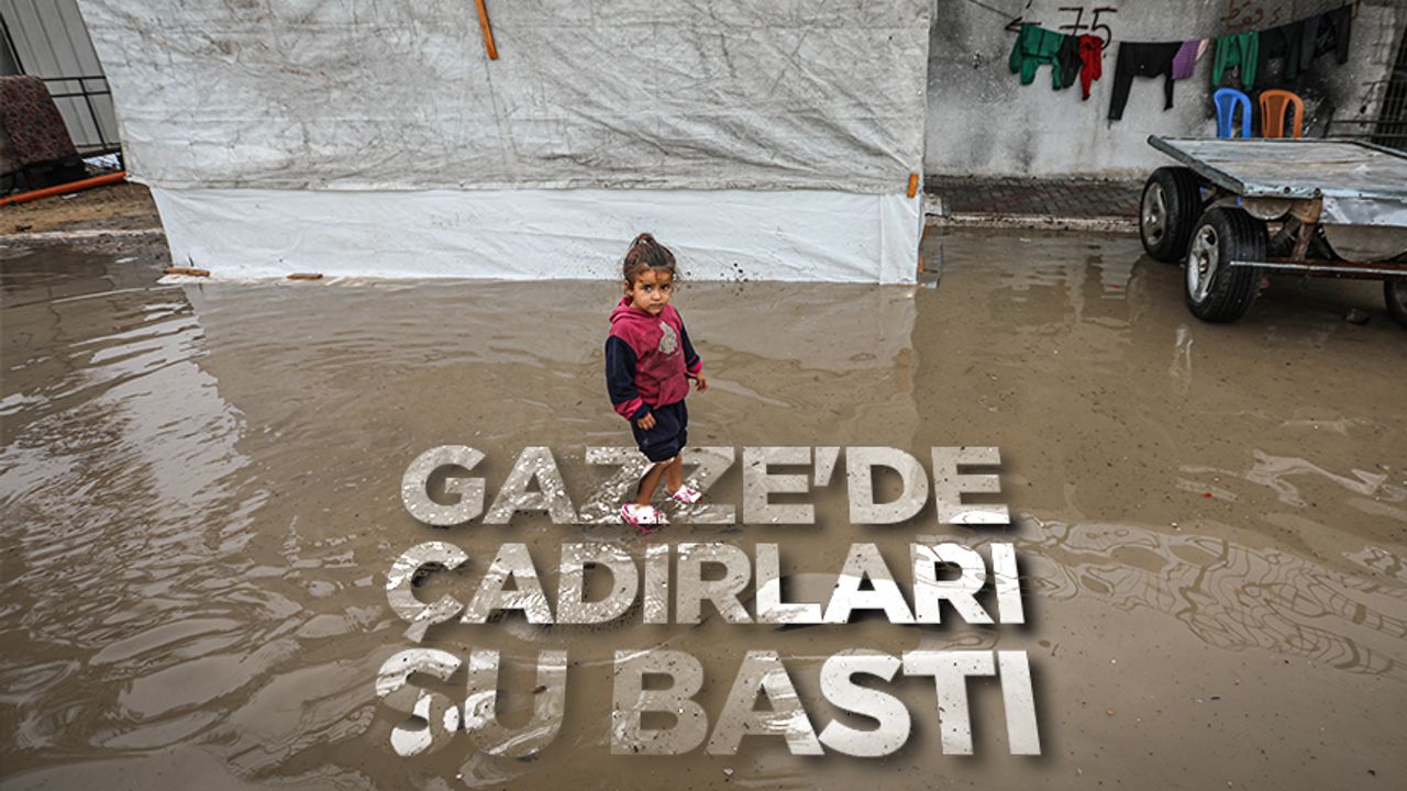 Gazze Şeridi'nde bu sabah yağan yağmur sonrası işgalcilerin 2 yıl süren saldırıları nedeniyle evleri yıkılan Filistinlilerin kaldığı Yermük Kampı'ndaki çadırları su bastı.