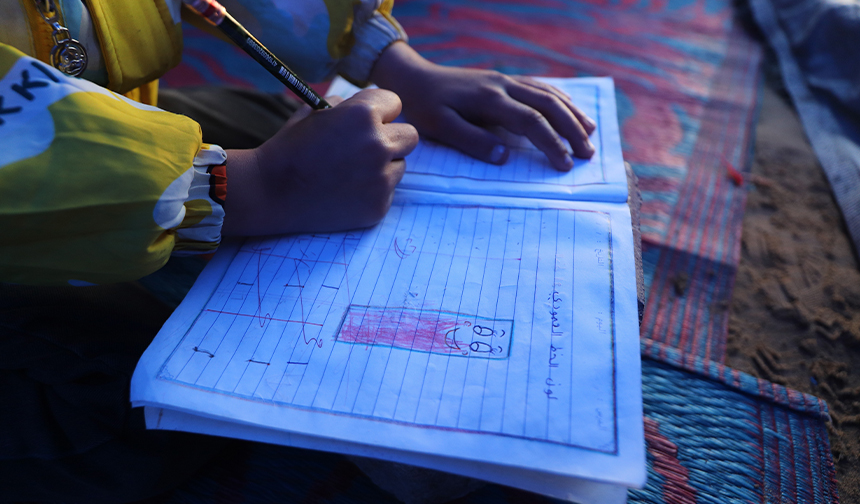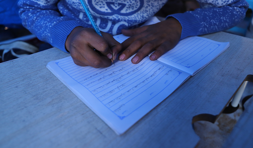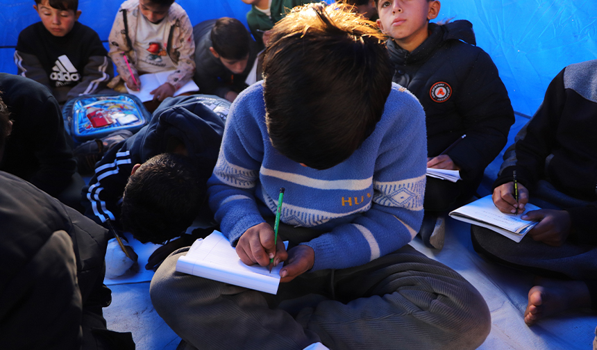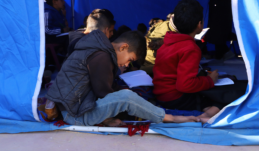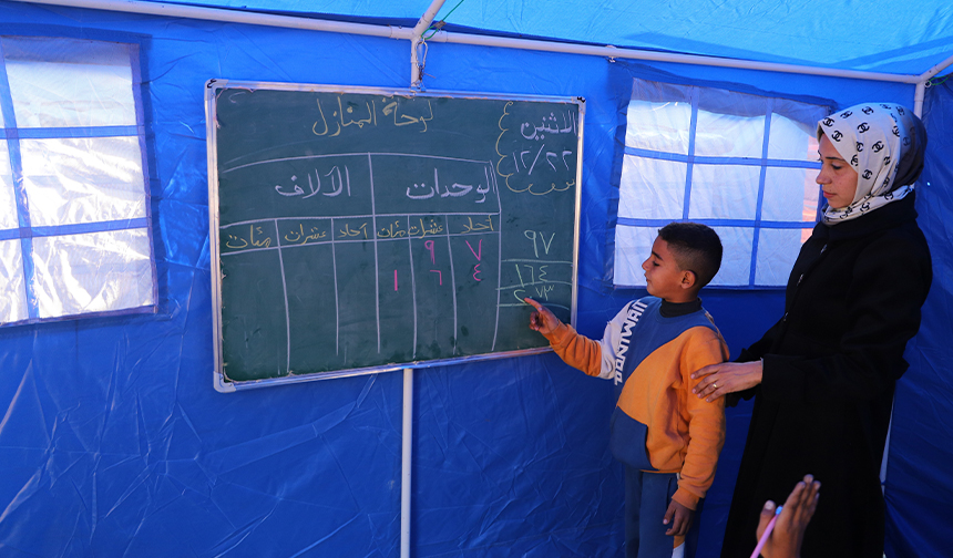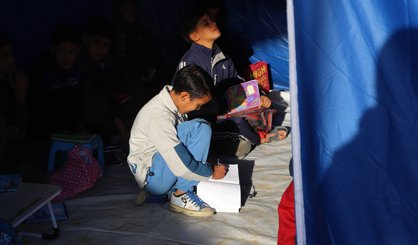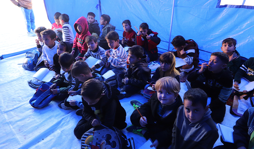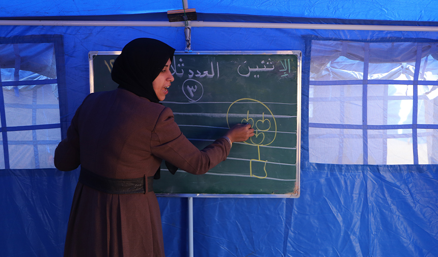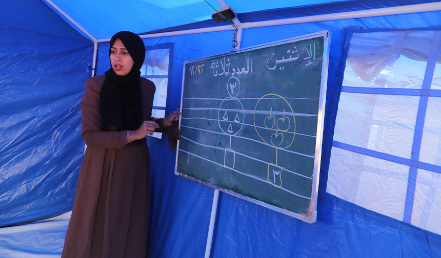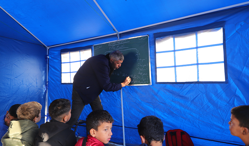 Öğretmenler, çadırlarda Arapça, İngilizce ve matematik başta olmak üzere temel ders eğitimi veriyor.