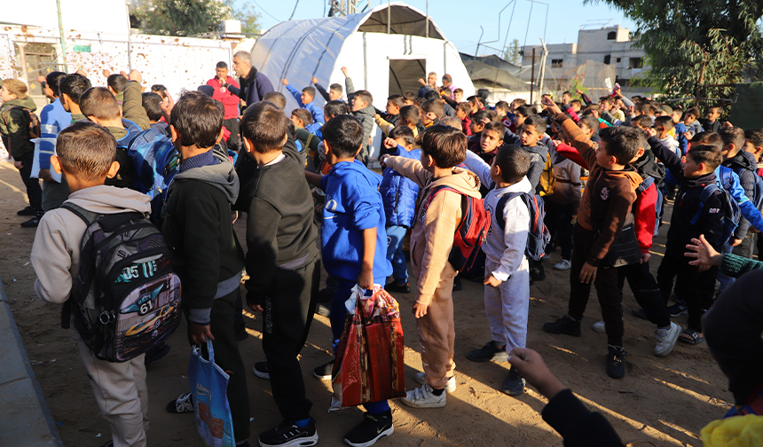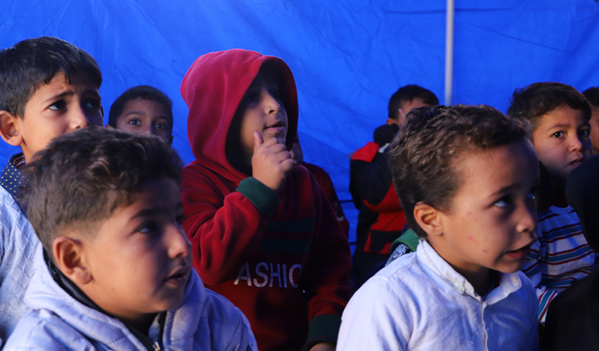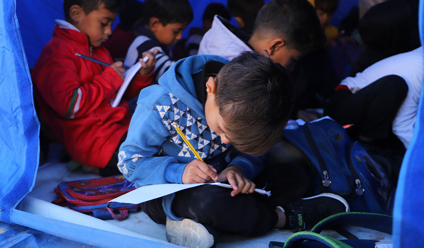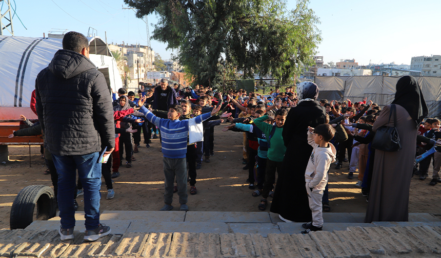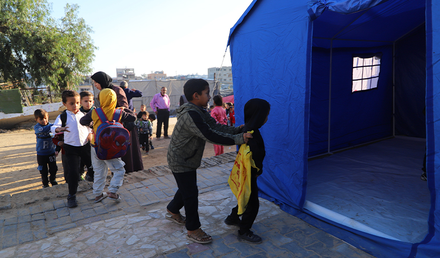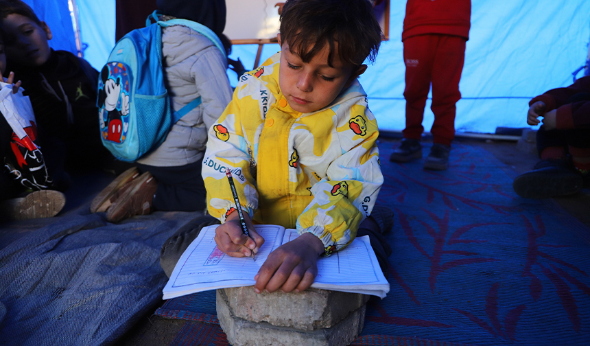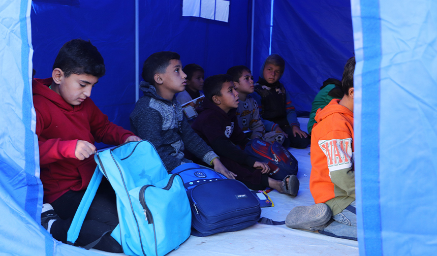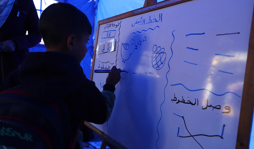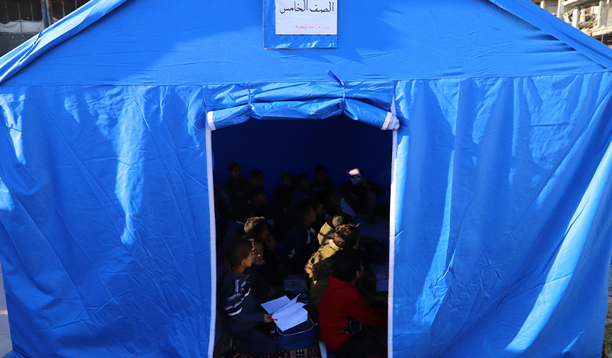 Gazze Şeridi’nin kuzeyindeki Beyt Lahiya’da bir grup gönüllü öğretmen, bölgede yaşanan abluka nedeniyle eğitimden mahrum kalan öğrenciler için eğitim çadırları kurdu.