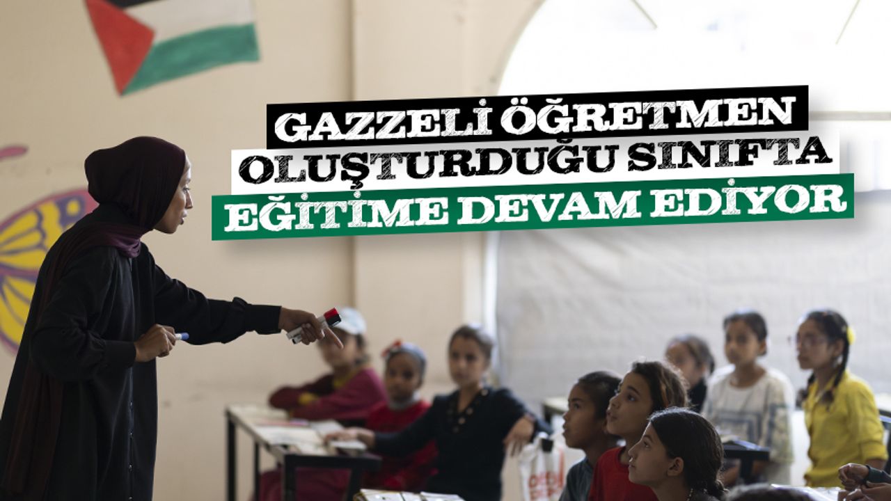 Gazze’de yerinden edilen öğretmen Dina Ukkaşe, kuzeyden göç ettikten sonra Gazze kentinde bulunan İslam Üniversitesi'nin hasar görmüş salonlarında çocuklar için sınıflar oluşturdu.
