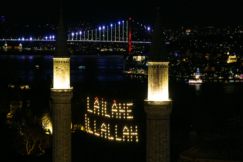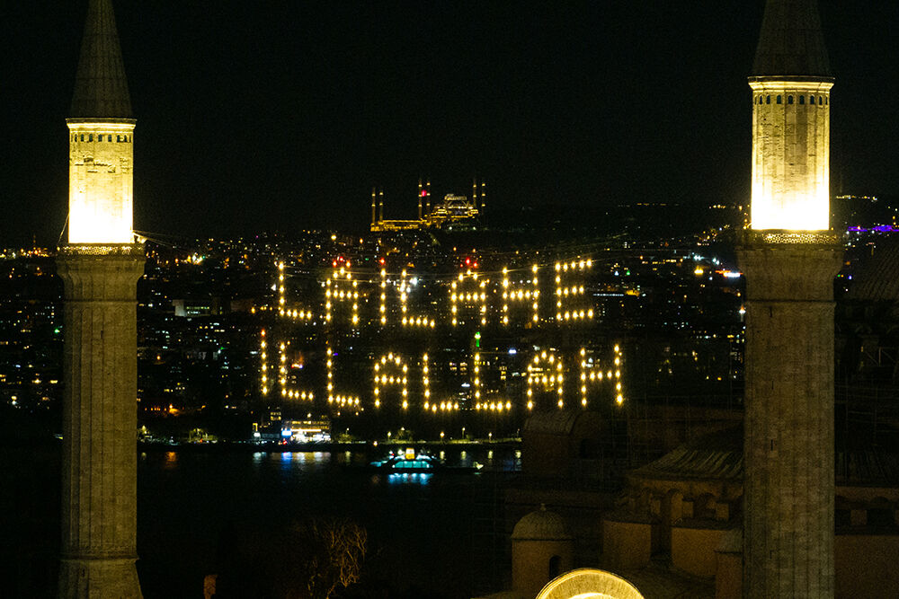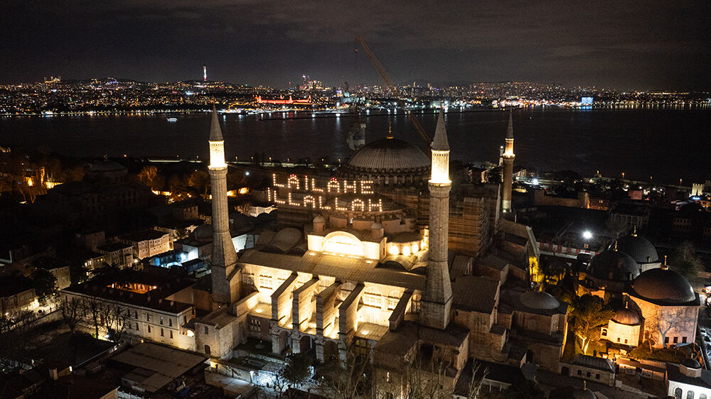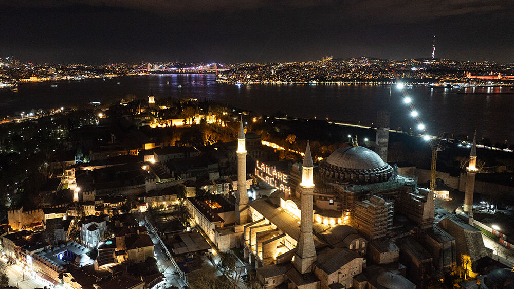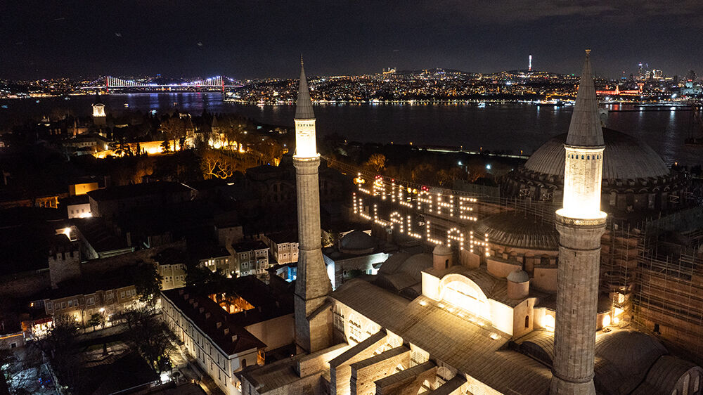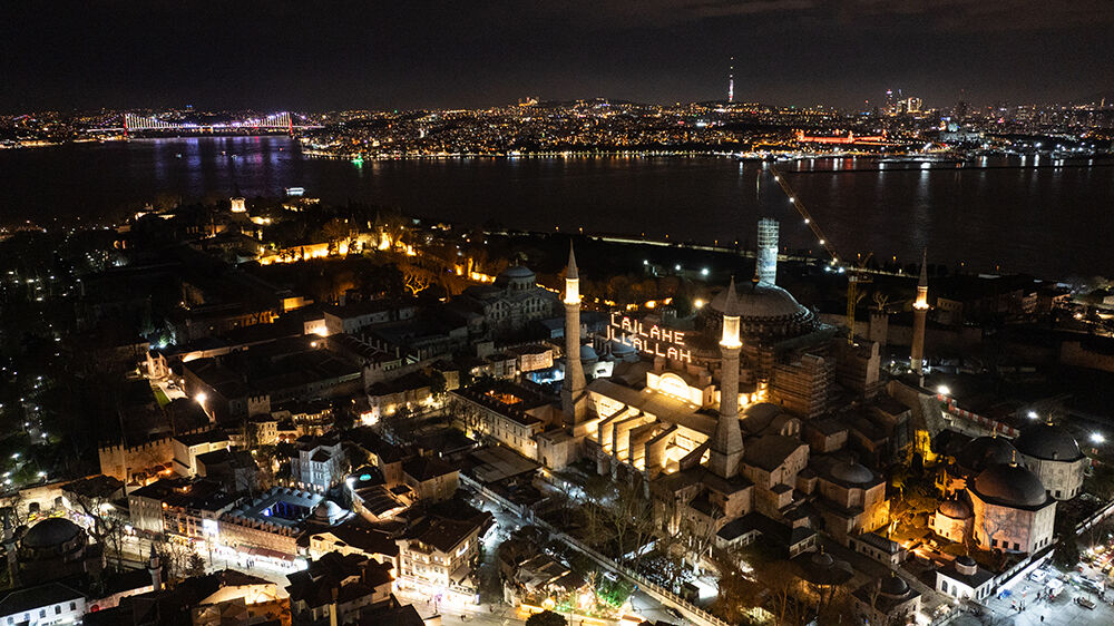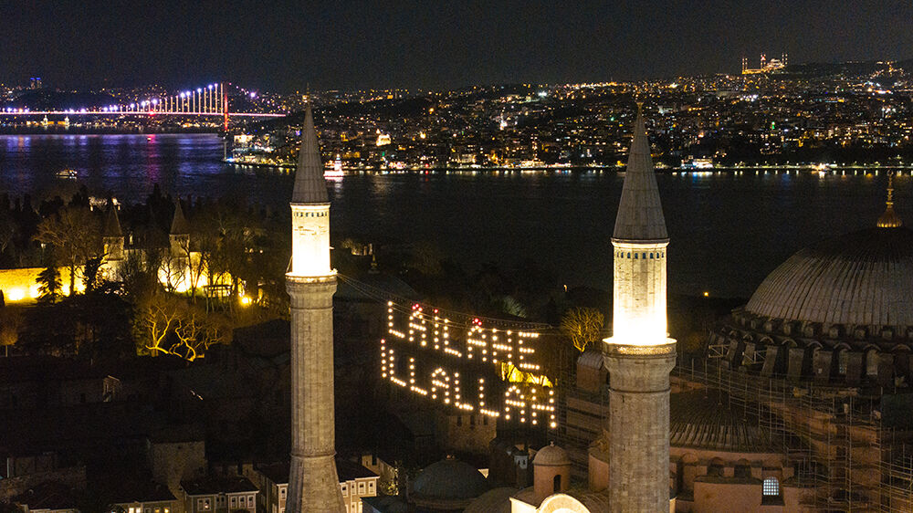 İstanbul’da ramazan ayı dolayısıyla minareleri arasına ‘’Lailaheillallah’’ yazılı mahya asılan Ayasofya-i Kebir Cami-i Şerifi havadan görüntülendi.