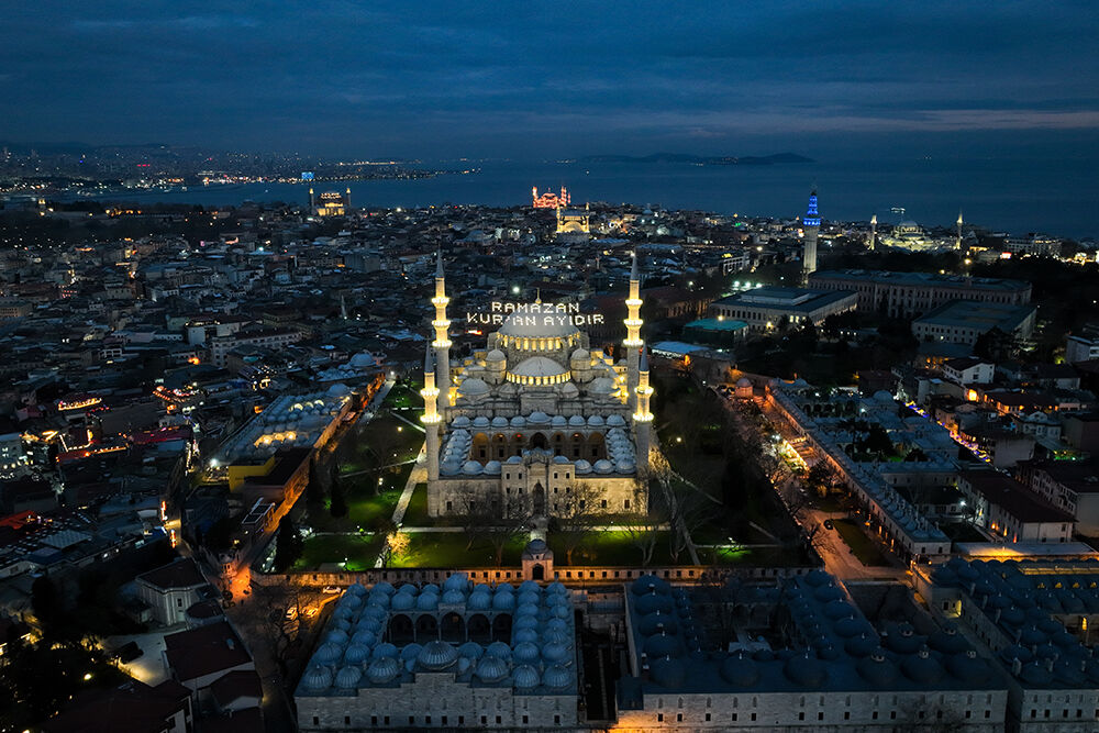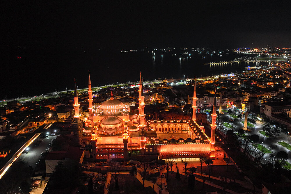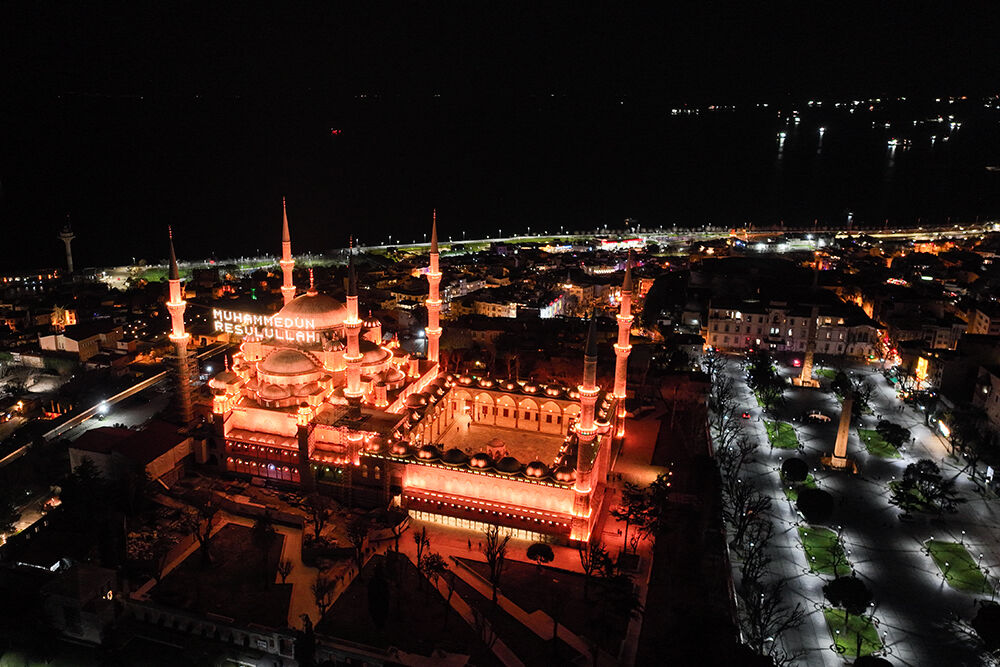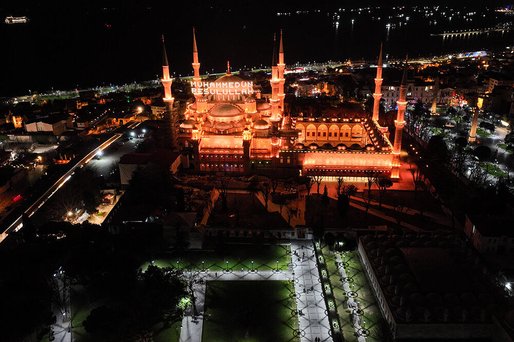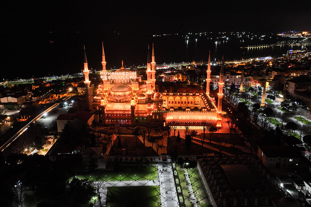 İstanbul’da ramazan ayı dolayısıyla minareleri arasına ‘’Muhammedün Resulullah’’ yazılı mahya asılan Sultanahmet Camii havadan görüntülendi.